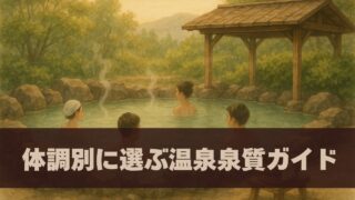 温泉ガイド 温泉の効能まとめ|体調別に選びたいおすすめ泉質 冷え性・肩こり・疲労回復・美肌・不眠など、体調別におすすめの温泉泉質を解説。効能早見表付きで、次の温泉選びに役立ちます。 2025.10.05 温泉ガイド